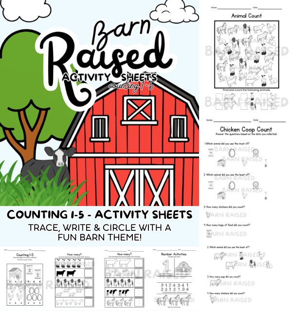 Fun and educational Livestock Counting Activity Sheets for numbers 1-5, sized at 8.5" x 11", designed to help kids build early math skills. Includes 28 total activities for tracing numbers, writing numbers and circling the correct answers—all with a fun barn theme! Digital download only. All sales are final. Not to be resold in any capacity.